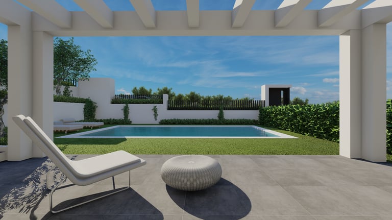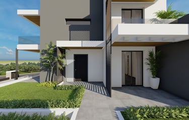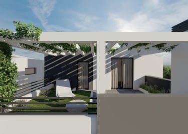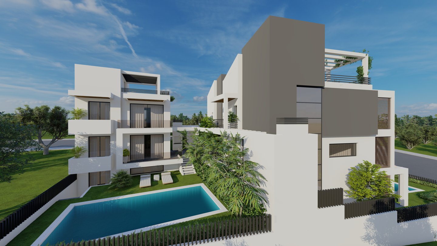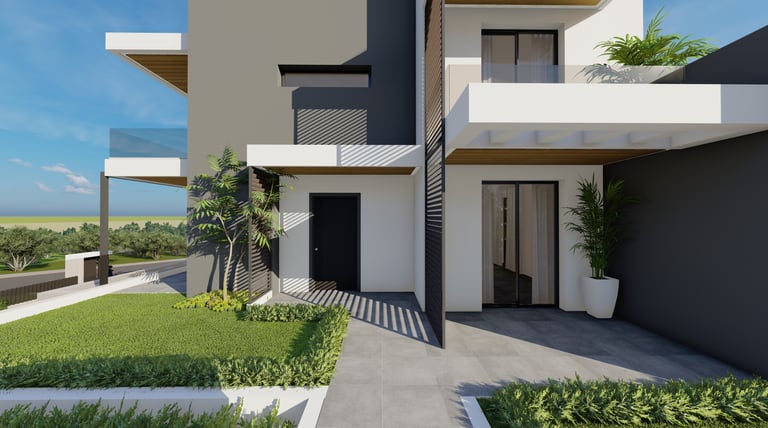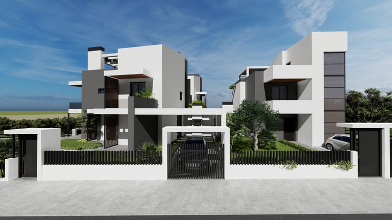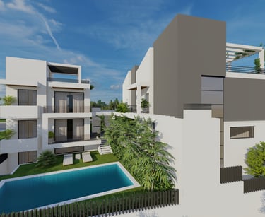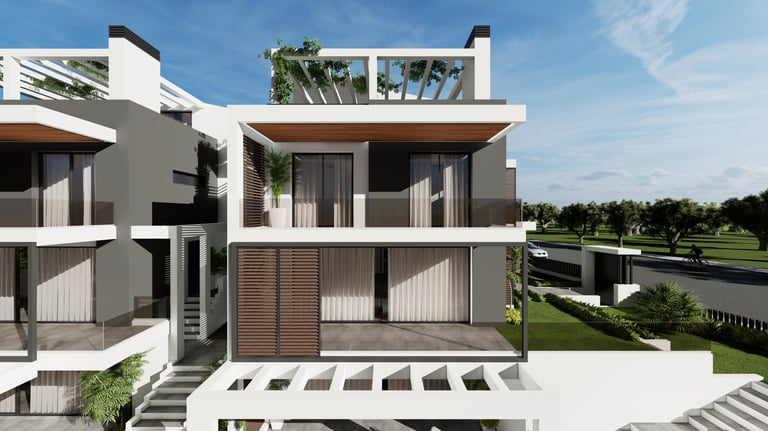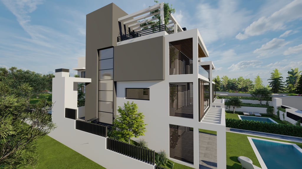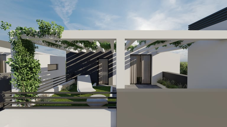 Ενσωματωμένες Πέργκολες Σκυροδέματος: Κατασκευασμένες ως μέρος της κύριας δομής του κάθε κτιρίου, οι πέργκολες από οπλισμένο σκυρόδεμα προσφέρουν σκιασμένους εξωτερικούς χώρους στο ισόγειο και τις ταράτσες, συνδυάζοντας λειτουργικότητα με αρχιτεκτονική κομψότητα.