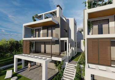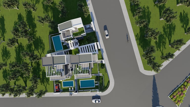 Σημείωση:Τα όρια που απεικονίζονται σε αυτήν την τρισδιάστατη απεικόνιση είναι λιγότερο εμφανή για λόγους οπτικής παρουσίασης. Στην πραγματικότητα, τα όρια μεταξύ των κατοικιών θα είναι σαφώς διαχωρισμένα, με υψηλότερη και πιο ενισχυμένη φύτευση, ώστε κάθε κατοικία να διασφαλίζει απόλυτη ιδιωτικότητα.